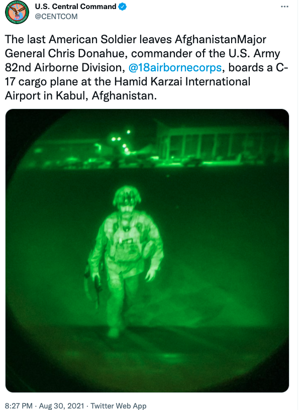Is the last American soldier to have set foot in Afghanistan. The last American soldier to leave Afghanistan- Major General Chris Donahue boarded C-17 aircraft on August 30 marking the end of US mission in Kabul tweeted US Department of Defense along with. US Central Command commander General Kenneth F McKenzie said on Monday that the last US.